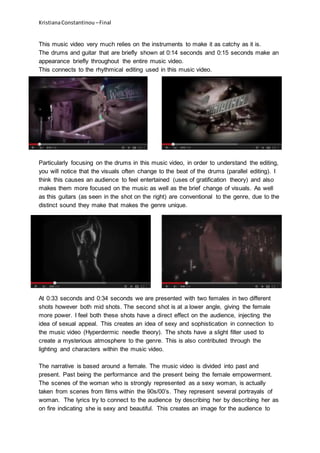 This music video by Bo Saris for the song "She's on Fire" features footage from films of actresses like Salma Hayek and Demi Moore. It is filmed in a style evocative of 1960s jazz/blues music videos, with minimal lighting focusing on the band's instruments. The costumes worn by the band and clips of women in the video connect it to the sophisticated representation of the jazz/blues genre. Brief shots of instruments like the drums and guitar match the rhythmical editing of the video and help focus attention on the music.