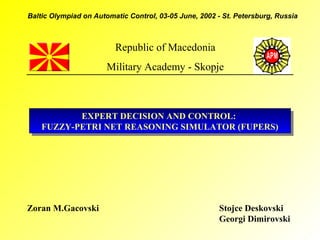 The document describes a fuzzy-Petri net reasoning simulator called FUPERS. FUPERS uses a Petri net model to represent fuzzy production rule systems for expert decision making and control. It allows modeling of parallel and concurrent processes in fuzzy rule-based systems. FUPERS implements an algorithm for data-driven execution of the fuzzy knowledge base using compositional rule inference. It was developed to overcome limitations of computational demands for real-time applications like controlling a mobile robot to avoid obstacles.