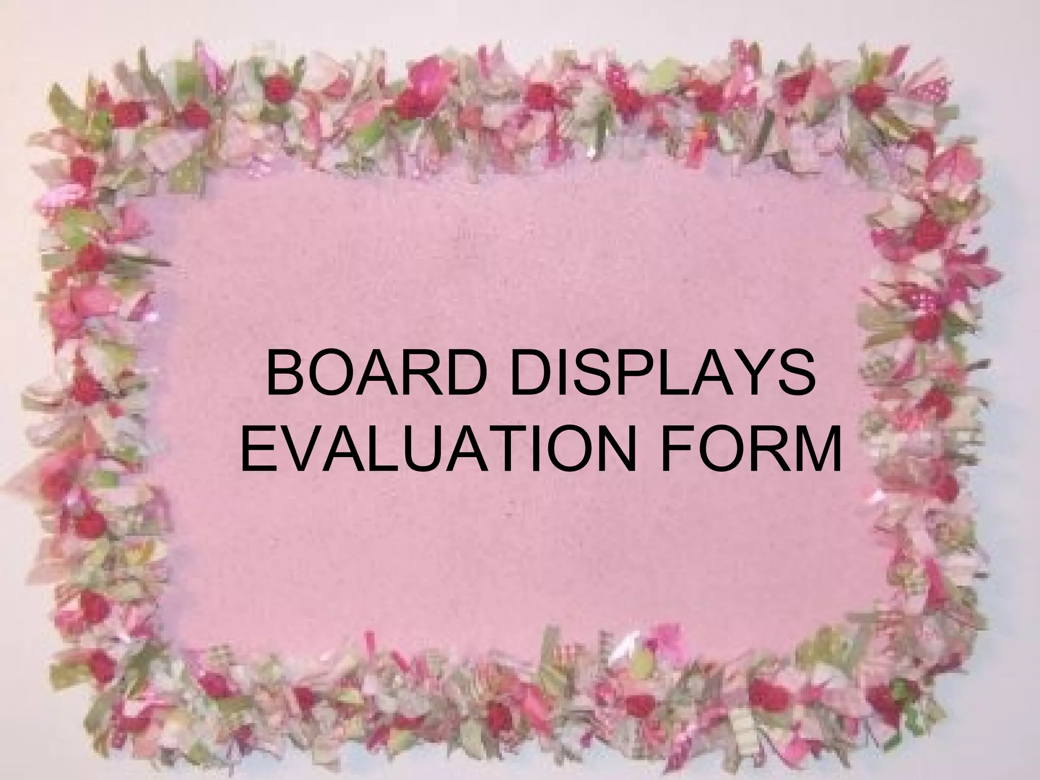 The document describes a board display evaluation form that rates bulletin boards on various criteria such as effectiveness of communication, attractiveness, balance, unity, interactivity, legibility, correctness, and durability. Based on the evaluation, some boards need improvement in areas like clarity of writing and repair. The document recommends repairing damaged boards and using colorful materials to better engage audiences.
