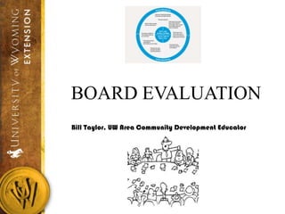 The document outlines the importance of board evaluations in nonprofit organizations, emphasizing continuous improvement, self-assessment, and accountability. It provides methods and techniques for evaluating board performance, individual board member contributions, and the effectiveness of the chief executive. Evaluation should be conducted periodically and can include tools such as surveys, dashboards, and structured feedback to enhance governance and operational efficiency.