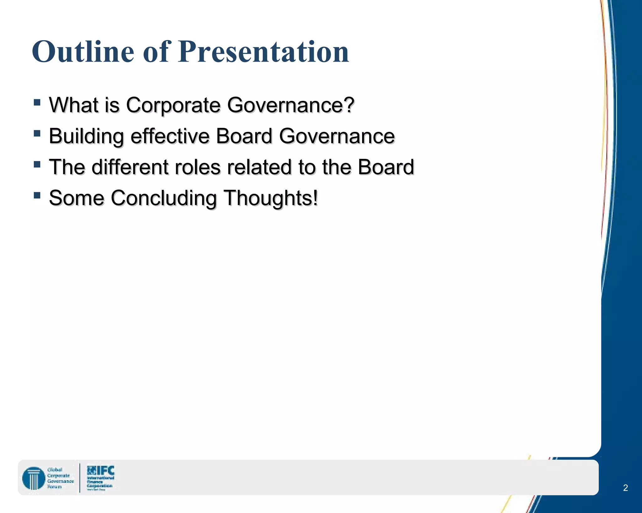 This document discusses the role of boards of directors in corporate governance. It defines corporate governance and outlines how boards can build effective governance through defining roles, putting in place governance arrangements, and ensuring proper oversight. It describes the key roles of the board chairman and CEO and discusses how board committees and instruments like charters can enhance effectiveness. The document also addresses boards' responsibilities in areas like financial oversight, risk management, and upholding legal principles of directorship.