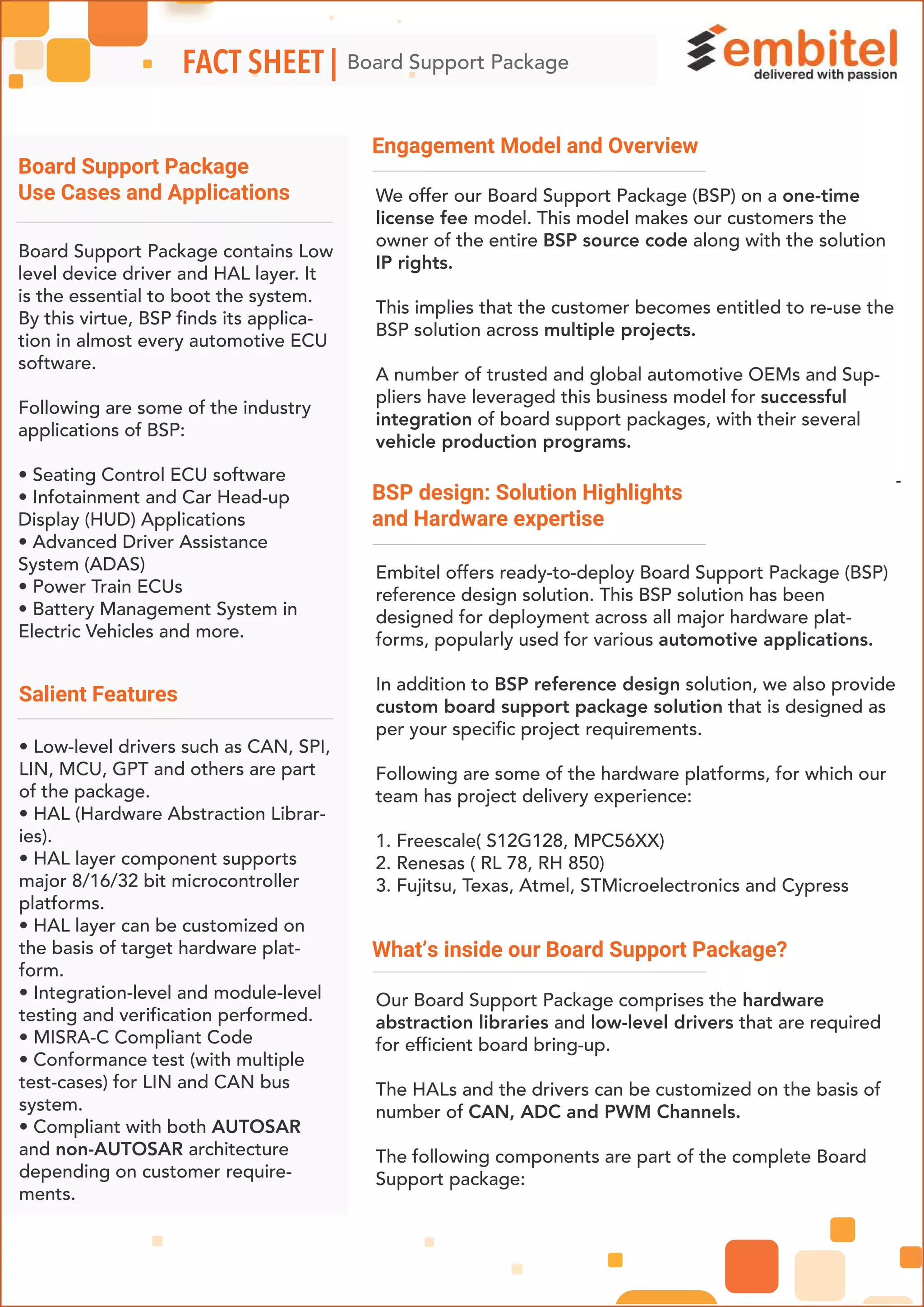 The document outlines the features and benefits of the board support package (BSP) offered by Embitel for automotive applications, including a one-time licensing model allowing customers ownership of the BSP source code. The BSP includes essential hardware abstraction libraries and low-level drivers that facilitate the integration of various automotive electronic control units (ECUs) across different hardware platforms. Key applications include advanced driver assistance systems, infotainment systems, and battery management systems, supported by comprehensive testing and customization services.
