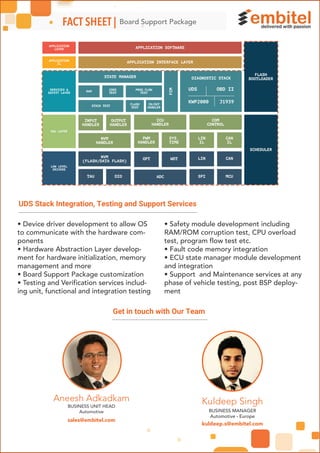 The document outlines a Board Support Package (BSP) solution offered by Embitel, which enables customers to own the BSP source code and rights for use in multiple automotive projects. It includes essential low-level drivers and hardware abstraction layers for efficient system booting across various hardware platforms, catering to applications such as ECU software, infotainment, and advanced driver assistance systems. Additionally, the BSP can be customized based on specific project requirements and adheres to industry standards for reliability and safety.
