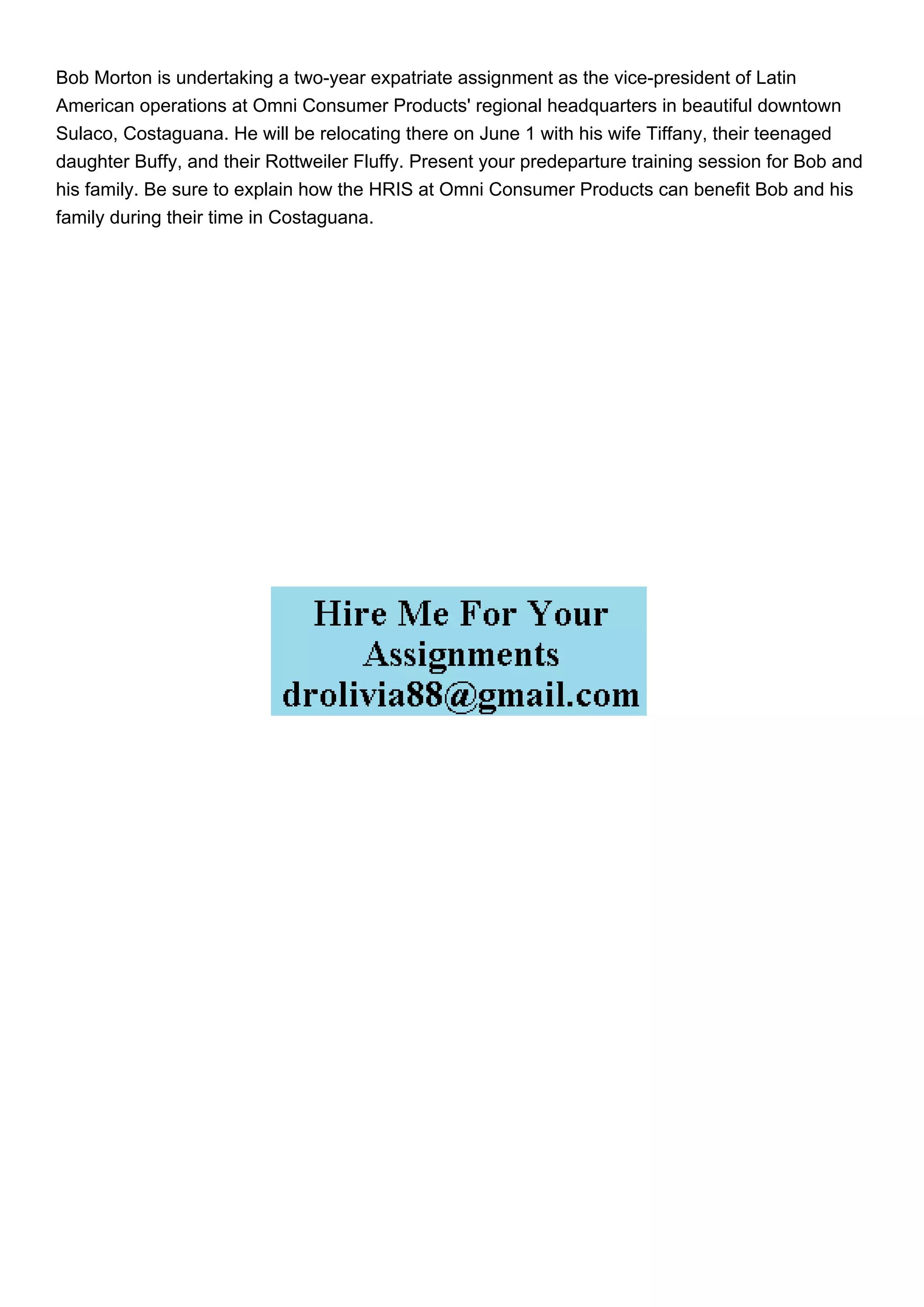 Bob Morton is starting a two-year expatriate assignment as vice-president of Latin American operations at Omni Consumer Products in Sulaco, Costaguana, relocating with his wife Tiffany, daughter Buffy, and their dog Fluffy. A predeparture training session should be arranged for the family. It's important to explain how the HRIS at Omni can support them during their stay.