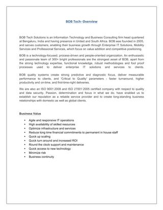BOB Tech Solutions is an IT consulting firm headquartered in Bengaluru, India that provides enterprise IT solutions, mobility services, and professional services. They have over 300 employees and serve both domestic and global clients. They are ISO certified for quality and data security. Their services include product engineering, enterprise mobility, and professional services like staff augmentation, hire/train/deploy models, and remote IT staffing. They aim to provide faster, reliable, and cost-effective business solutions through collaborative work with clients.