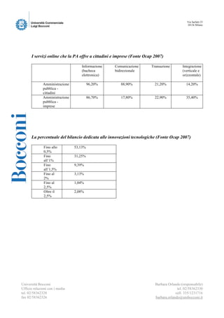 Il documento analizza l'occupazione nella pubblica amministrazione italiana nel 2007, con un totale di 3.366.467 unità, evidenziando un calo di circa 200 mila unità dal 2004 e la predominanza di impiegati nel comparto scuola. Inoltre, descrive le caratteristiche demografiche e retributive dei dirigenti pubblici, sottolineando differenze retributive significative tra ministeri e enti locali. Infine, analizza l'avanzamento dell'e-government con il 60% dei comuni che ha raggiunto un rapporto di 1:1 tra computer e dipendenti.