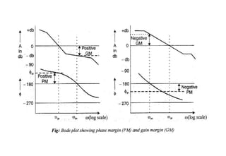 The document discusses Bode plots, which illustrate the frequency response of control systems through magnitude and phase graphs. It outlines the procedures to draw Bode plots, analyze system stability using gain and phase margins, and provides examples of calculating these parameters. Key factors affecting the plots, such as constant, first order, and second order factors, are also explained along with their implications on system stability.