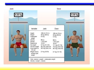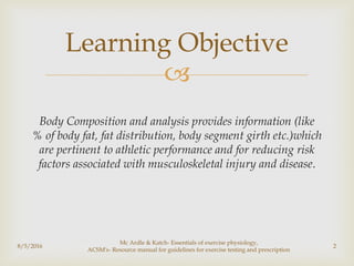 Body composition analysis provides information about percentages of body fat, fat distribution, and body measurements that are useful for athletic performance and health. There are direct and indirect methods of analyzing body composition, with indirect methods including hydrostatic weighing, bioelectrical impedance, air displacement plethysmography, and skin fold measurements. Each method has advantages and limitations regarding accuracy, reliability, required equipment and cost.