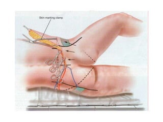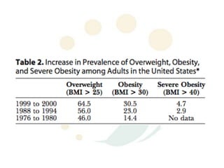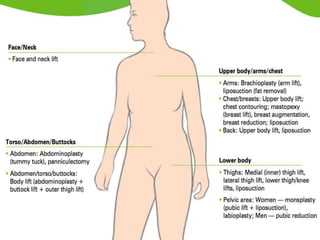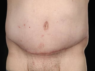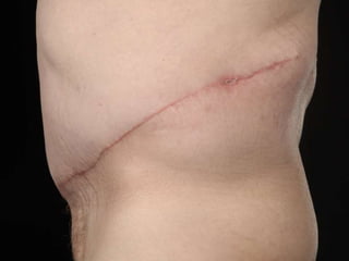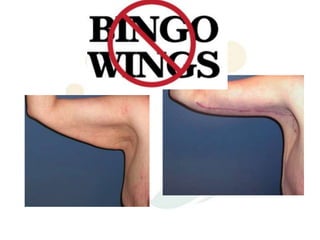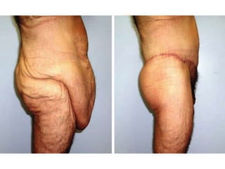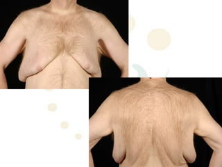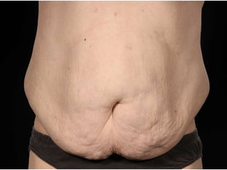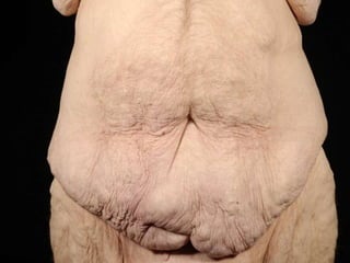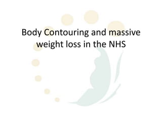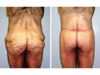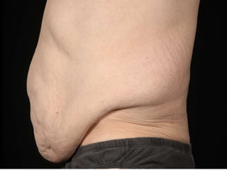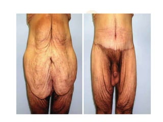 A 48-year-old man who lost 200 kg through diet and exercise underwent a lower body lift. During the 4-hour, 2-surgeon procedure, he required repositioning 3 times and 6 drains. Post-operatively he developed hemorrhages requiring exploration. He was discharged after 8 days requiring weekly drainage of seromas. The document discusses nutritional deficiencies common after bariatric surgery that can impact wound healing for body contouring procedures. It notes diet and exercise patients have higher complication rates than those who had bariatric surgery. Careful patient evaluation and counseling is important due to the risks and limitations of massive weight loss body contouring.