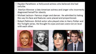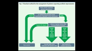 Body dysmorphic disorder (BDD) is a psychological disorder where patients are excessively concerned about a perceived flaw in their physical appearance. BDD was first described in the late 19th century and is now recognized by the American Psychiatric Association. It affects about 0.7-3% of the population and commonly presents in dental practices. Patients with BDD may request cosmetic procedures but are rarely satisfied with treatment outcomes and their concerns typically shift to another body part. The disorder is best managed through cognitive behavioral therapy and medication rather than further cosmetic treatments.