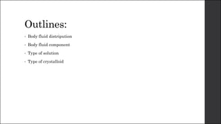 The document discusses body fluid distribution and components, explaining that total body fluid constitutes about 60% of body weight and can be divided into intracellular and extracellular fluids. It outlines different types of solutions used in medical contexts, such as isotonic, hypotonic, and hypertonic solutions, along with their uses and precautions. Additionally, it highlights the importance of fluid volume assessment and monitoring in maintaining normal body function.