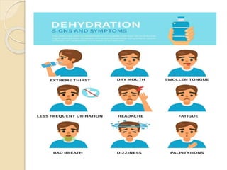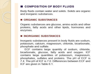 Body fluids make up over two-thirds of the human body, with water being the primary component. Body fluids are distributed between two compartments - extracellular fluid (ECF) and intracellular fluid (ICF). The concentration of body fluids is expressed in terms of osmolality, osmolarity, and tonicity. Isotonic fluids have the same concentration as body fluids, while hypertonic fluids are more concentrated and hypotonic fluids are less concentrated. The body maintains water balance through various mechanisms to prevent dehydration or water intoxication.