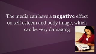 This document discusses the negative impact of media on body image and self-esteem, especially for young people and women. Statistics show that many feel worse about their appearance after seeing photoshopped images portrayed as ideals. This leads to issues like low self-esteem, depression, and eating disorders. However, some magazines and brands are now showing untouched photos of "real" women to counter unrealistic standards of beauty. The document encourages readers to accept themselves and not let the media define their self-worth or how they should look.