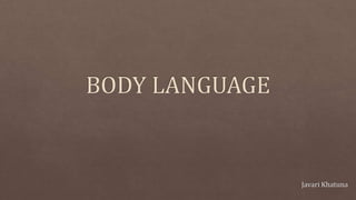 Body language refers to nonverbal communication signals like facial expressions and gestures. Experts estimate that 60-65% of communication is nonverbal. It is important to understand body language cues, but also consider other signals like context. Nonverbal communication can repeat, contradict, substitute for, or accent verbal messages. Types of body language include facial expressions, eye contact, mouth movements, posture, gestures, use of personal space, touch, and vocal tones/qualities. Interpreting these cues can provide insight into emotions, attitudes, and the truthfulness of messages.