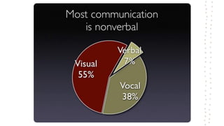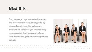 Body language refers to the non-verbal signals conveyed through facial expressions, gestures, and postures that communicate thoughts and feelings. Some examples of common body language include: