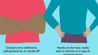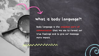 Body language is an important form of non-verbal communication that reveals people's true feelings and impacts the message being conveyed. It allows people to understand each other by reading body language cues and matching them to spoken words. Mastering body language can help with persuasion, understanding what others are saying, and navigating day-to-day social interactions. Some key aspects of body language include facial expressions, eye contact, posture, gestures, and physical positioning and movement.