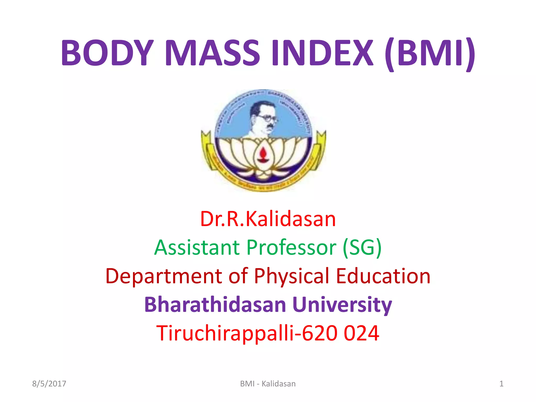 The document discusses Body Mass Index (BMI) which is a measure of body fat based on height and weight. It was initially devised in 1830 by Adolphe Quetelet and the term "BMI" was coined in 1972 by Ancel Keys. The document provides details on calculating BMI, BMI categories and cut-offs, limitations of BMI, diseases associated with overweight and obesity, and alternatives to BMI for measuring body composition. It also discusses the history and applications of anthropometry and kinanthropometry in assessing body measurements.