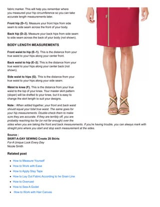 Accurate body measurements are essential for creating personalized clothing, starting with a good tape measure and proper attire. Key measurements include true waist, hip circumference, and various lengths between waist and hips, which should be recorded for future reference. Tips for accuracy include using straight pins to mark measurements and ensuring the measuring tape is parallel to the ground.