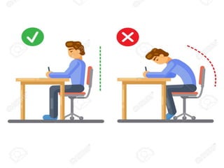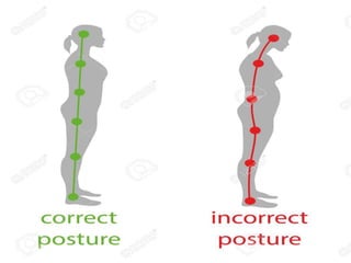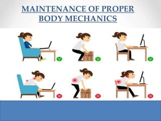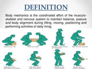 Body mechanics refers to the efficient use of the body as a machine for locomotion and movement. It is related to proper functioning of bones, joints, muscles, nerves, and the brain to maintain posture and balance. Some key principles of good body mechanics include facing the direction of movement to prevent spine twisting, dividing tasks between arms and legs to reduce back injury risk, and using rolling and turning which require less force than lifting. Maintaining proper alignment and mobility is also important for reducing fatigue and injury risk. Factors like age, energy level, lifestyle, fear, pain and disabilities can impact a person's mobility. Prolonged immobility can increase risks of issues like pneumonia, blood clots, pressure sores,