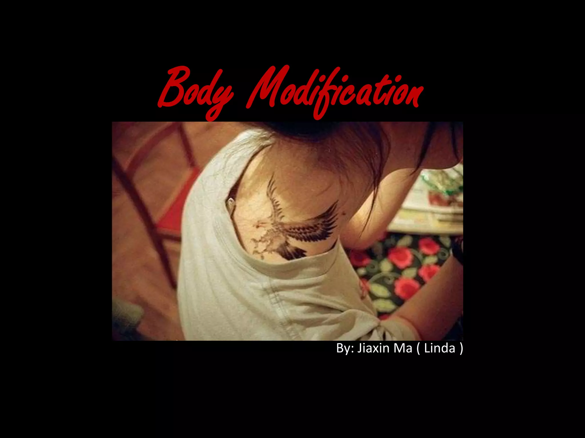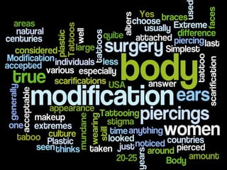 The document discusses body modification such as tattoos and piercings. It notes that while these modifications have become more common, especially among teenagers, they can have negative health impacts and career consequences that people do not always consider. The risks include infection, allergic reactions, and discrimination during job hiring if visible tattoos or piercings are against company policies. The document advocates that people seriously consider these factors and wait until age 21 before getting tattoos or piercings to avoid potential regrets.