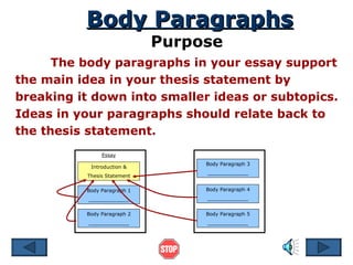The document discusses key features of effective body paragraphs in essays, including topic sentences, supporting sentences, and concluding sentences. It provides definitions and examples of each. A topic sentence should express the main idea of the paragraph in a complete sentence. Supporting sentences then provide additional details and explanation relating to the topic sentence. The paragraph concludes with a sentence that summarizes or leaves the reader with a final thought. Good paragraphs also demonstrate unity by keeping all sentences focused on the single topic or idea introduced in the topic sentence.