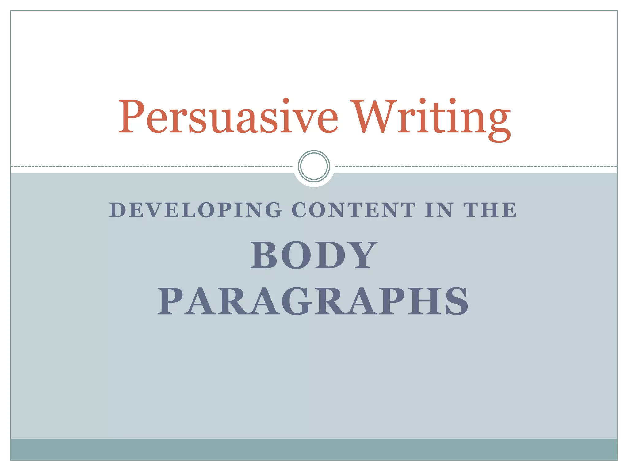 This document provides guidance on developing effective content for the body paragraphs in a persuasive essay. It recommends including a topic sentence stating a claim that supports the thesis, facts or examples supporting the claim, and explanations of how the facts/examples connect to the claim. Body paragraphs should utilize a variety of persuasive techniques like ethos, pathos, and logos. The document also discusses using counter-arguments to present opposing views and then refute them to strengthen one's own argument.