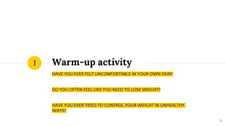 The document discusses body positivity and eating disorders. It defines common eating disorders like anorexia, bulimia, binge eating disorder, and other specified feeding or eating disorder. It then discusses the body positive movement, which believes all people should have a positive body image regardless of physical appearance. It notes some criticism of the movement that it could promote health negativity. The document provides a definition of body positivity and a quote about beauty being comfortable in your own skin.