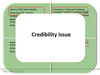 The document discusses a SWOT analysis and action plan for The Body Shop brand. It identifies strengths such as a strong CSR brand identity and retail network, but also weaknesses like high seasonality and credibility issues regarding its CSR claims. The action plan proposes addressing credibility through opinion leader outreach, transparent communication, celebrity ambassadors, and two-way engagement on social media and digital platforms to stimulate discussion and showcase implementation of public ideas.
