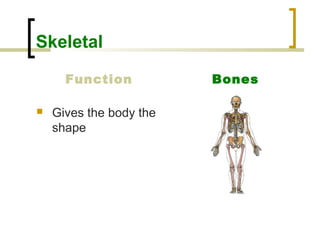 The document discusses the main functions and organs of the five major human body systems: skeletal, muscular, digestive, circulatory, and respiratory. The skeletal system gives the body its shape using bones. The muscular system helps the body move using voluntary muscles like the fingers and involuntary muscles like the heart. The digestive system breaks down food for energy using the mouth. The circulatory system moves oxygen and food throughout the body using veins. Finally, the respiratory system takes in oxygen and removes carbon dioxide using the lungs, nose, and diaphragm.