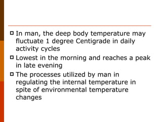 The document discusses body temperature regulation in humans. It notes that core body temperature normally fluctuates about 1 degree Celsius daily and is lowest in the morning and highest in the late evening. It also outlines the various mechanisms the body uses to regulate temperature, including heat production and loss processes like radiation, conduction, convection, evaporation, and sweating.