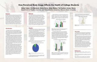 120 students participated in a survey about body image consisting of questions on knowledge, physical activity, environment, and attitude. The majority were sophomores aged 21, with 76 living off-campus and 44 on-campus. Results showed that knowledge of nutrition and exercise recommendations was highest for grains and fruits/vegetables, and lowest for oils. 31.7% engaged in low-impact activity 8+ times a week, with 63.3% of off-campus students attending the gym more than on-campus (26.7%). Females and younger students relied more on friends/family for health info and had less knowledge. The study aims to determine the dominant factor influencing body image and support past findings