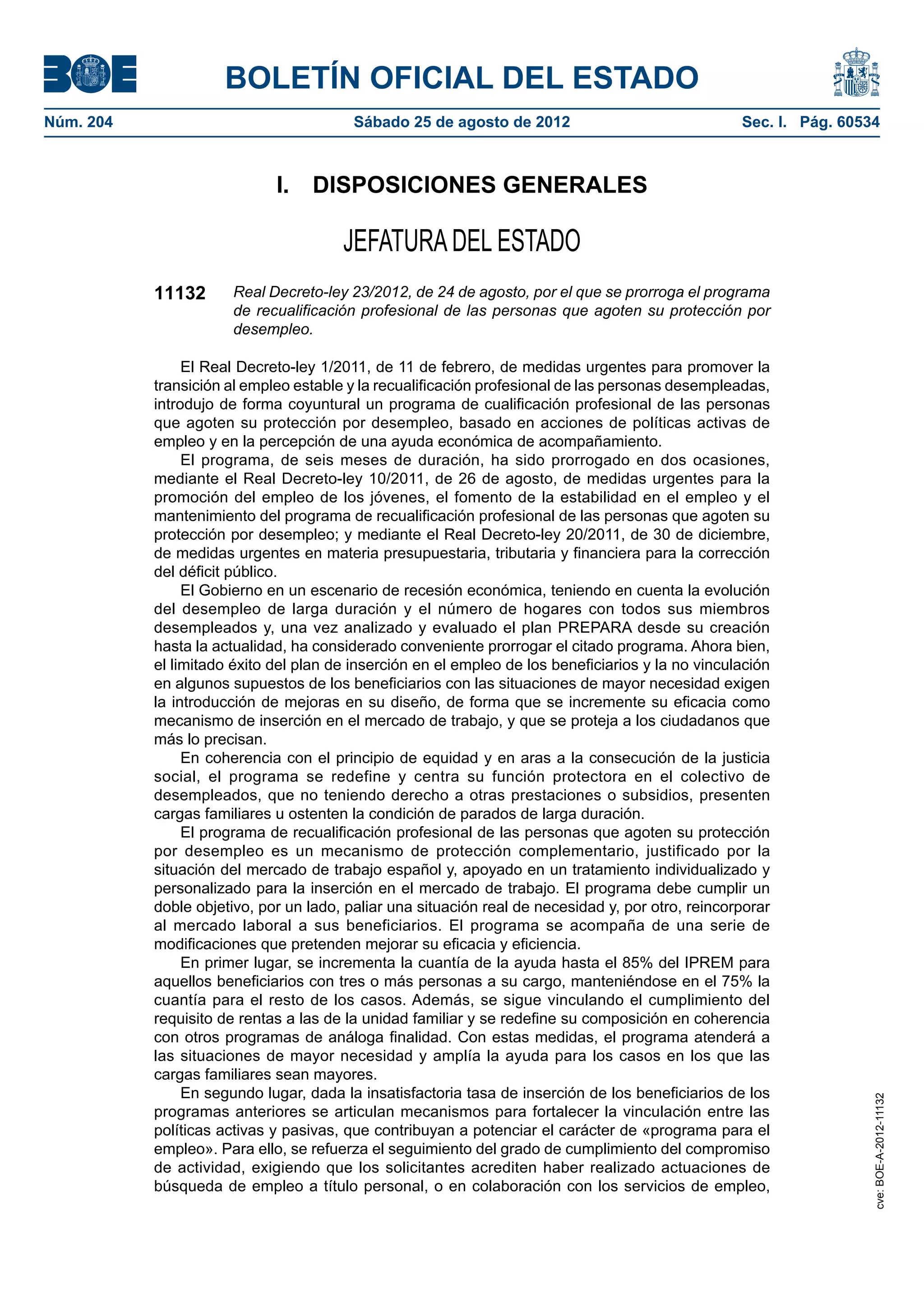 Este documento presenta un resumen de tres oraciones del Real Decreto-ley 23/2012, el cual prorroga el programa de recualificación profesional para personas desempleadas en España. El programa ofrece capacitación y una ayuda económica para facilitar la reinserción laboral. El decreto introduce mejoras como incrementar la ayuda para familias numerosas y fortalecer los vínculos con servicios de empleo para mejorar los resultados de inserción laboral.