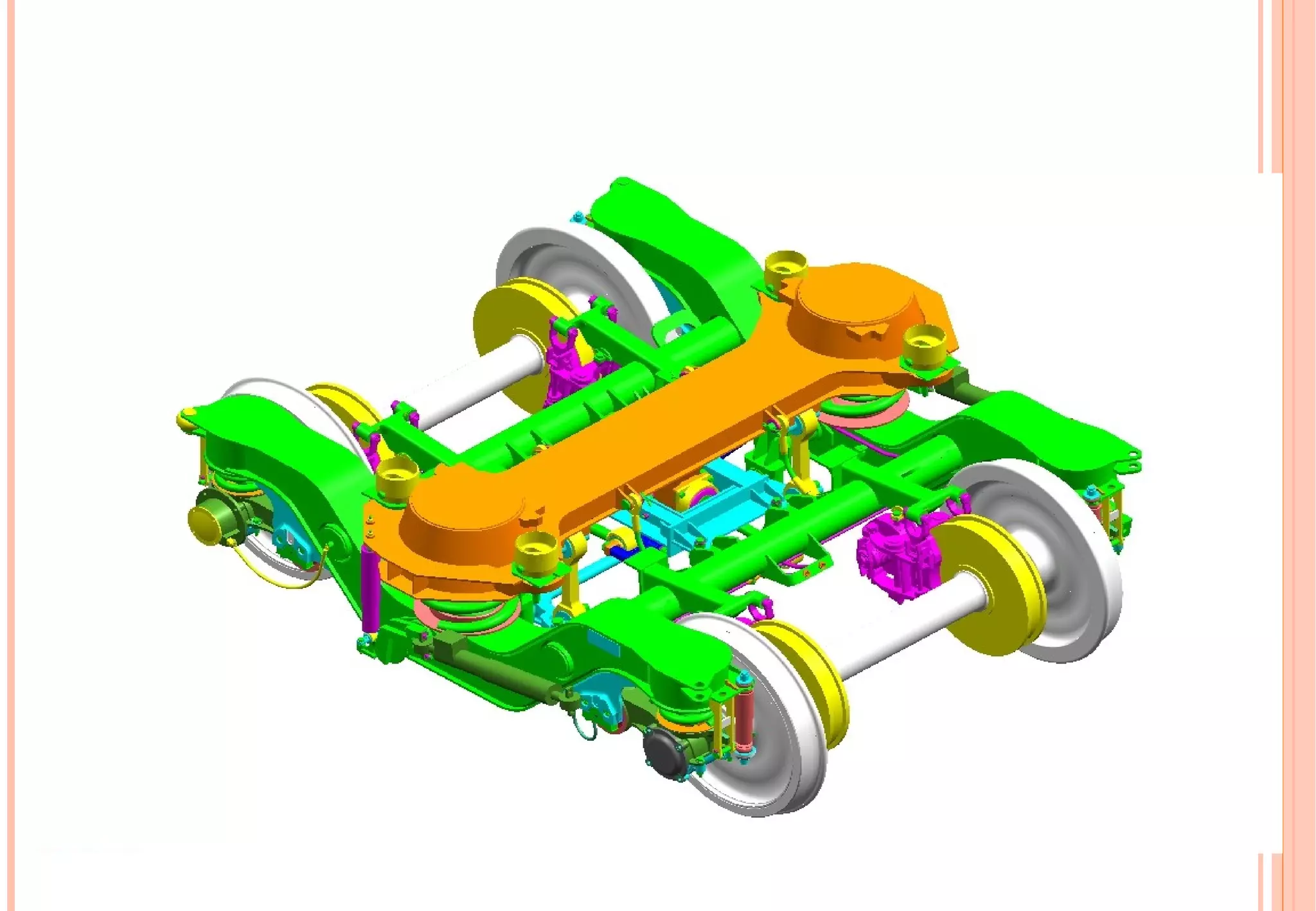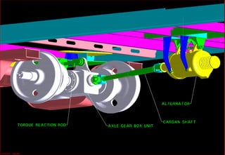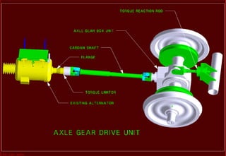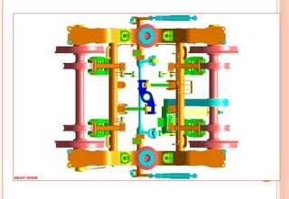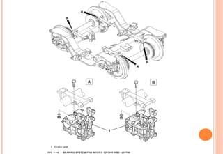 This document provides details on the design features of a FIAT bogie used in Indian railways. It describes the main sub-systems of the bogie including the Y-frame bogie, wheelset, primary and secondary suspensions, braking system, and principles of force transmission. It also provides specifications of materials used, dimensions of wheelsets, suspension variants for different coach types, and performance parameters like speed limit and ride index.