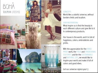 The document outlines a digital marketing plan for an e-commerce brand selling Bohemian home decor products in Brazil. The plan includes developing a clean and functional website, blog, and mobile site. It also discusses building traffic through search engine optimization, social media advertising, partnerships with bloggers, and buzz marketing. Key actions include launching advertising campaigns, integrating online and offline promotions, email marketing, and monitoring brand metrics over time.