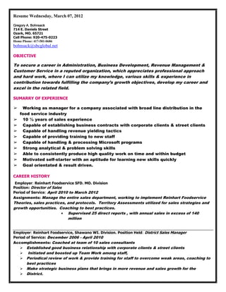 Gregory Bohnsack is seeking a career in administration, business development, revenue management, or customer service. He has over 10 years of sales experience, including positions as a director of sales and district sales manager. He is skilled in establishing business contracts, revenue growth tactics, training, and Microsoft programs.