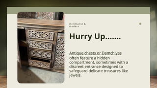 https://www.houzz.com/products/seller--era_chandok https:/www.mogulinterior.com/collections/architecture-elements Brimming with ethnic and cultural influences from distant lands, a vintage bridal chest—traditionally known as a Damchiya—serves as a stunning centerpiece in boho-chic interiors. Crafted from reclaimed materials, this handmade treasure exudes old-world charm while doubling as a functional console table. Its hidden storage compartments and distinctive mid-door latch enhance its rustic allure, making it a perfect blend of artistry and practicality. The narrow Damchiya, a traditional hall chest, serves as a perfect platform for potted plants or a vibrant floral display. These intricately carved pieces showcase regional craftsmanship, with designs varying based on their origin—whether from southern India, Gujarat, Rajasthan, or Himachal in the north. Often adorned with sculpted reliefs of tribal women gracefully carrying water jars and stylized horse heads at the corners, each Damchia tells a story of heritage and artistry.