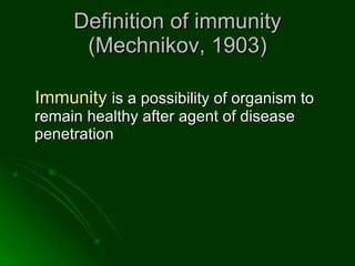 The document discusses nonspecific defense mechanisms, which provide immediate protection against pathogens as the first line of defense. It describes various physical and chemical barriers that block pathogen entry like the skin and mucous membranes. It also outlines cellular defenses such as phagocytes that engulf and destroy pathogens. Additionally, it examines soluble factors like complement proteins, lysozyme, and interferons that directly kill microbes or enhance immune responses.