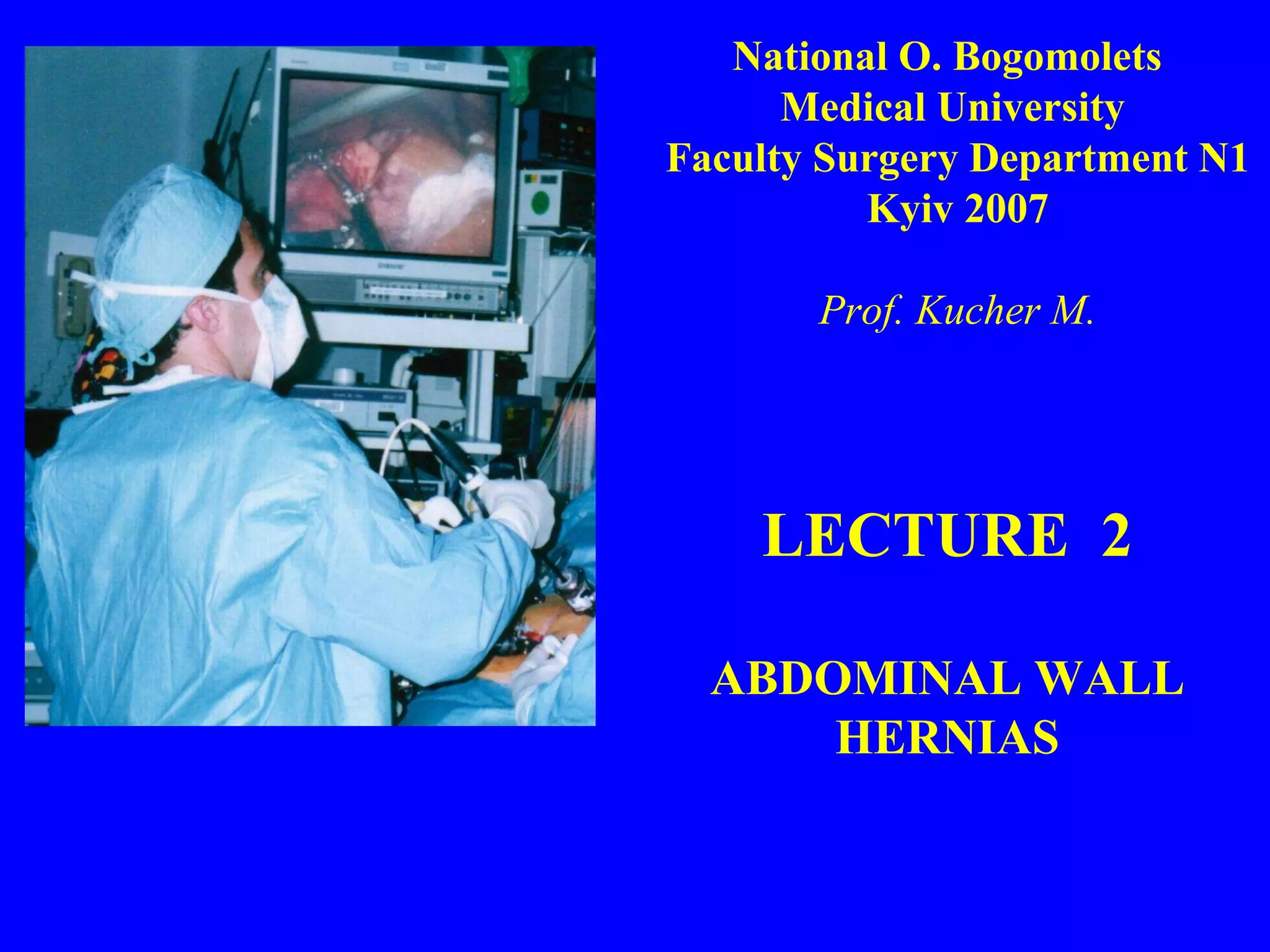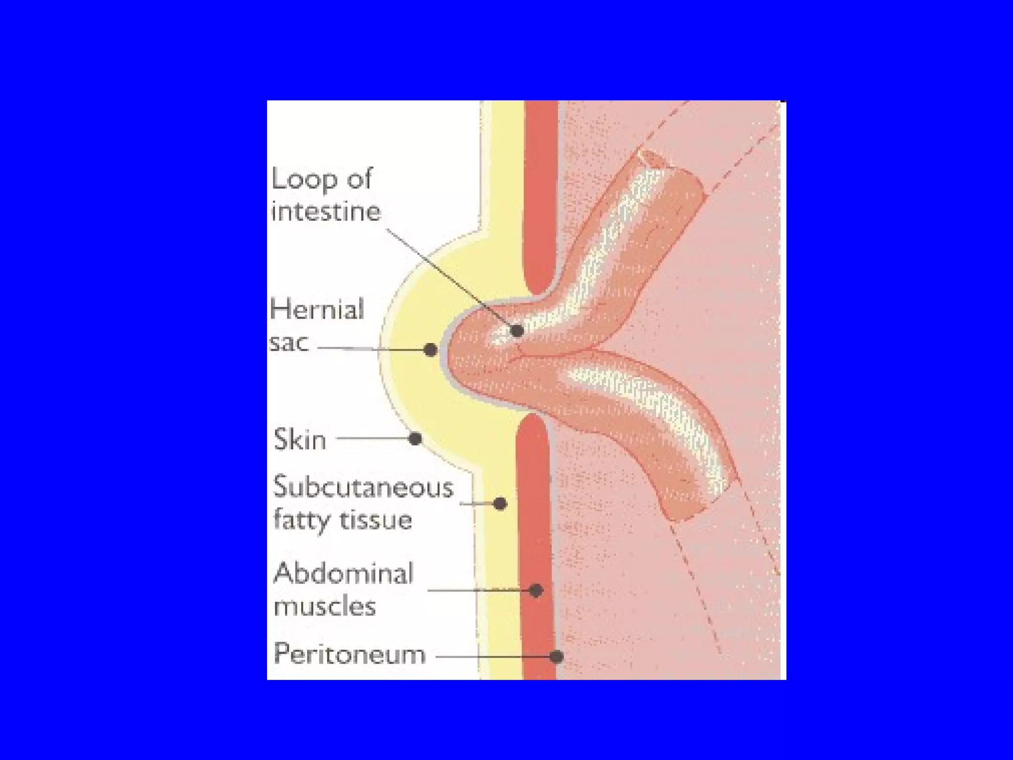 The document discusses abdominal wall hernias, including definitions, types, causes, symptoms, and treatments. It defines a hernia as a hole in the abdominal wall that allows internal structures to protrude outside. The main types discussed are inguinal, femoral, umbilical, and incisional hernias. Hernias develop due to weaknesses in the abdominal wall from factors like straining, injury, or surgery. Examination may reveal a bulge or pain that can be reduced. Treatment options include open or laparoscopic surgical repair, with mesh increasingly used to prevent recurrence.
