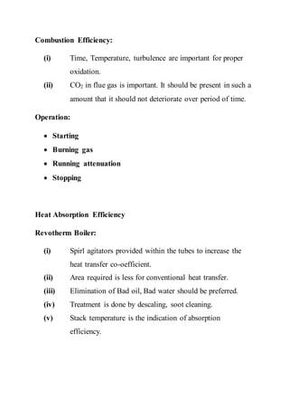 This document describes the principal operation and components of a boiler. It discusses the basics of combustion including fuel, heating surface, and air mixing. It provides the dimensions of the boiler, superheater, and economizer. It also covers combustion efficiency, heat absorption efficiency, safety precautions, constructional features, operational features, water treatment processes, maintenance procedures, and de-scaling of boilers.