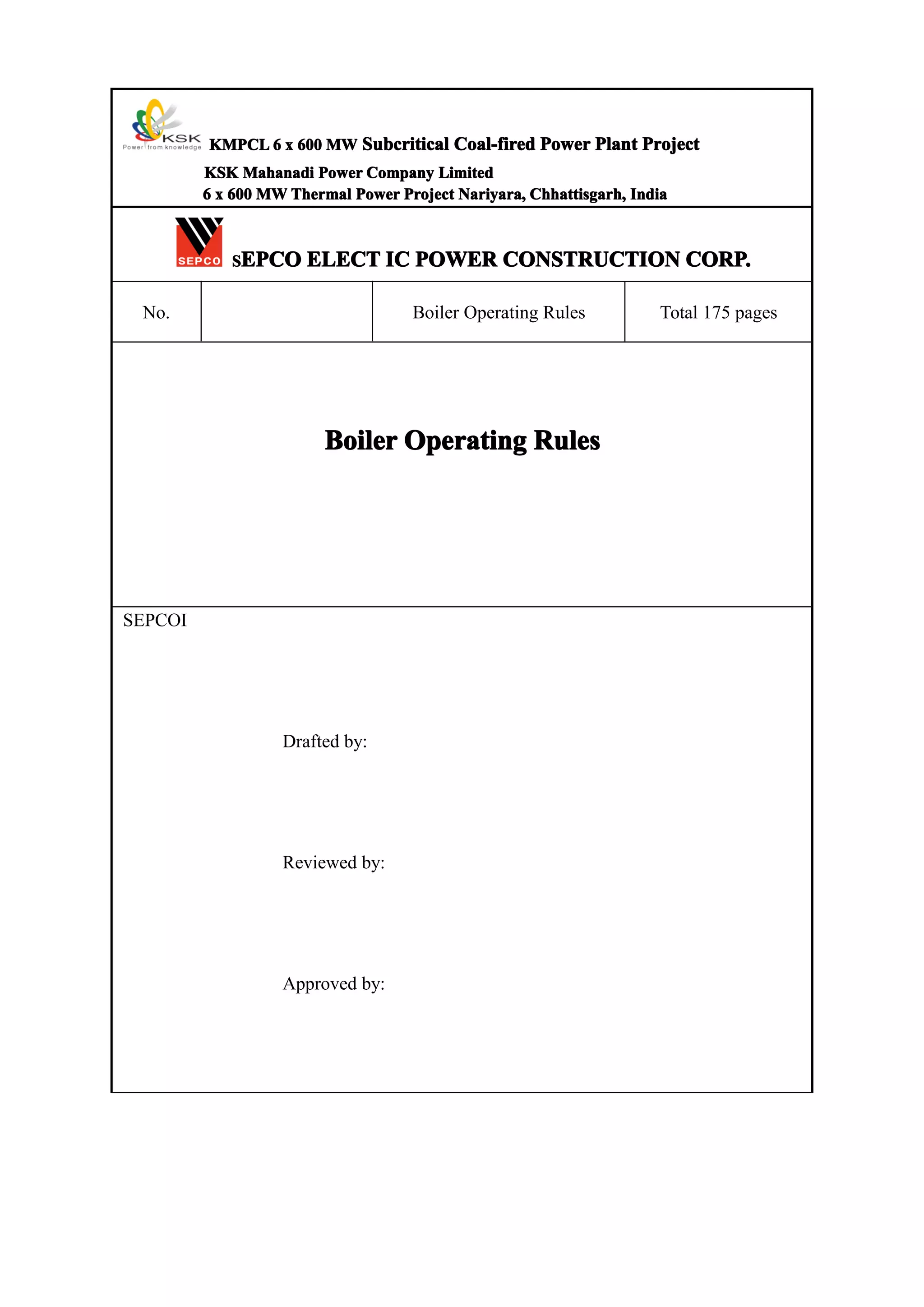 The document details the specifications and operational guidelines for a 600 MW subcritical coal-fired power plant established by Mahanadi Power Company Limited in Chhattisgarh, India. It covers critical features such as boiler design, startup procedures, interlocking protection, maintenance protocols, and troubleshooting measures. Key components of the boiler and their performance parameters are also specified across various sections.