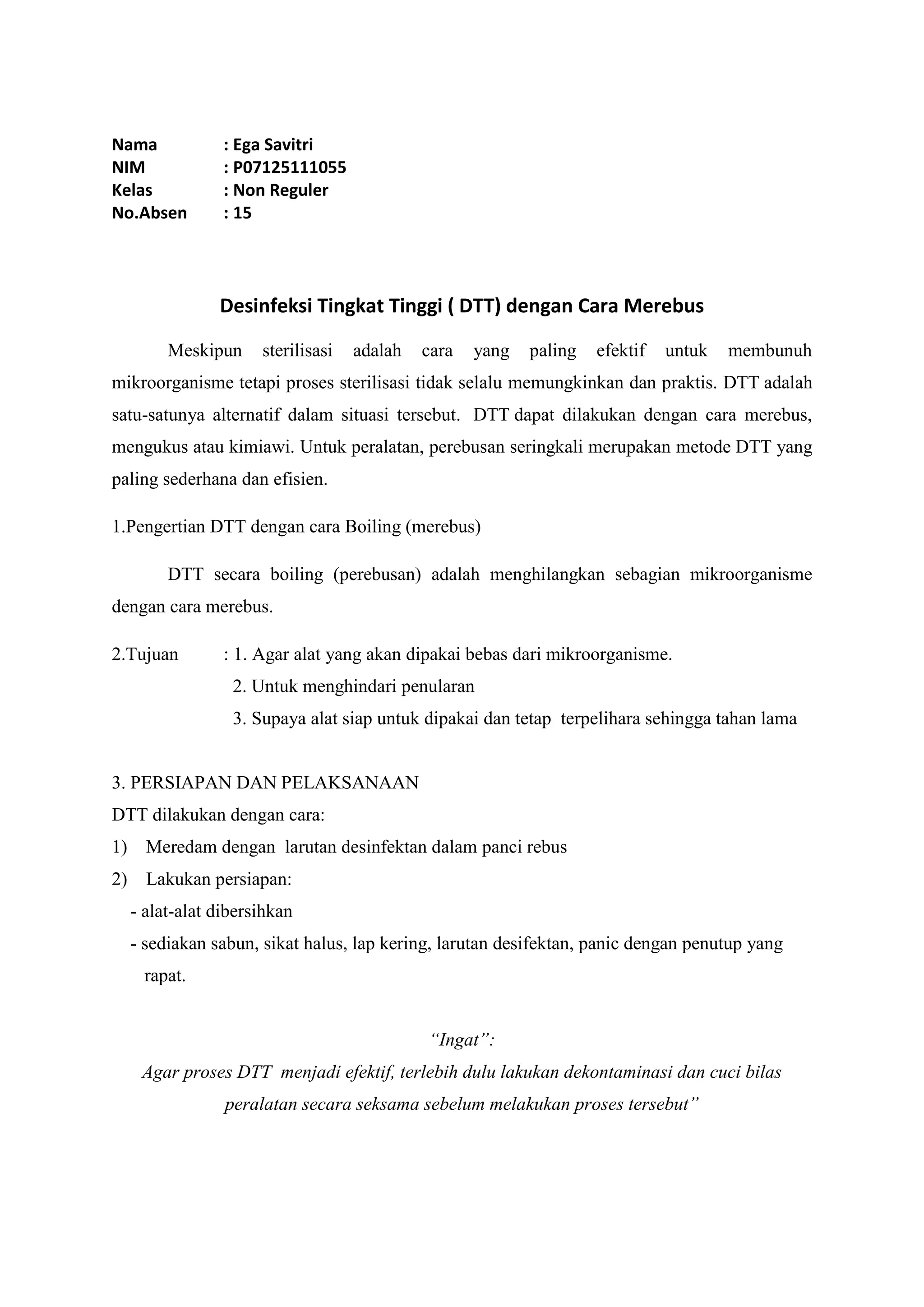 Dokumen ini menjelaskan prosedur desinfeksi tingkat tinggi (DTT) melalui metode merebus untuk membunuh mikroorganisme pada peralatan. DTT bertujuan untuk memastikan alat bebas dari mikroorganisme, mencegah penularan, dan menjaga ketahanan alat. Proses dilakukan dengan merendam alat dalam larutan desinfektan, merebus dalam panci tertutup selama 20 menit, dan menyimpan peralatan dalam wadah yang terjaga.