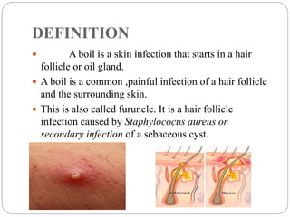 A boil is a painful skin infection caused by bacteria that starts in a hair follicle or oil gland. Boils most commonly occur on the neck, armpits, shoulders, buttocks, and face. They are precipitated by factors like diabetes, poor hygiene, and skin irritation. Treatment involves applying warm compresses, draining pus, administering antibiotics, and using homeopathic remedies like Belladonna or Hepar Sulphur to bring the boil to a head and aid healing. Preventing the spread of infection requires cleaning clothes and wounds as well as maintaining good hygiene.