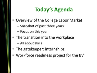 Dr. Philip Gardner gave a presentation on the college labor market and workforce readiness. He discussed trends over the past 3 years, noting strong growth in 2011-2012 but a more cautious outlook in 2012-2013 with only moderate hiring increases expected. He highlighted in-demand fields and obstacles employers face in hiring. Gardner also reviewed employers' perspectives on needed skills like problem-solving, communication, and managing priorities. Research from Boise State examined critical competencies and attitudes desired by employers.