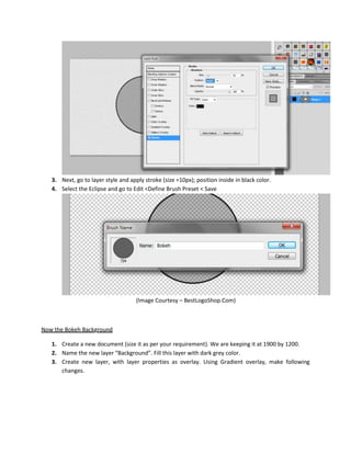 This document provides instructions for creating a unique bokeh background texture with a twist. It involves using a custom bokeh brush to make strokes on layers with different blur radii, then applying an offset filter to the final image to create a twist effect. The background is generated by filling layers, adding gradients and blending modes, before adding the blurred brush strokes. The result is a complex bokeh texture that can be used as a blog header or background image.