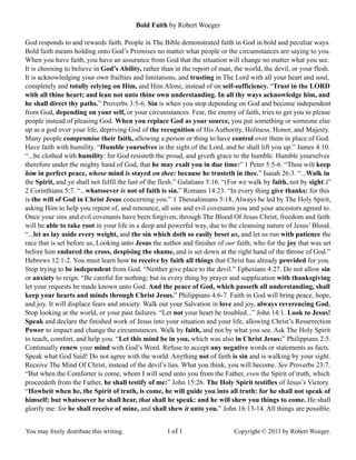 Bold faith means believing in God's promises and abilities rather than circumstances or other people. It requires fully trusting and depending on God alone. People in the Bible demonstrated bold faith in peculiar ways. Having faith brings peace because it relies on God rather than one's own understanding or strength. Faith is strengthened through humility, walking with the Holy Spirit, and focusing on Jesus as the source of faith rather than sin or independence.