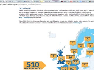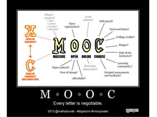 This document summarizes a webinar presentation about MOOCs and open educational resources (OER). It discusses the potential benefits of MOOCs and OER at the individual, institutional, national, and global levels, including increased personalization, sustainability, collaboration, and lifelong learning opportunities. It also briefly outlines some challenges related to quality assurance, recognition of learning, and supporting less commonly taught languages. Finally, it advertises an upcoming international workshop on policy for OER and less used languages.