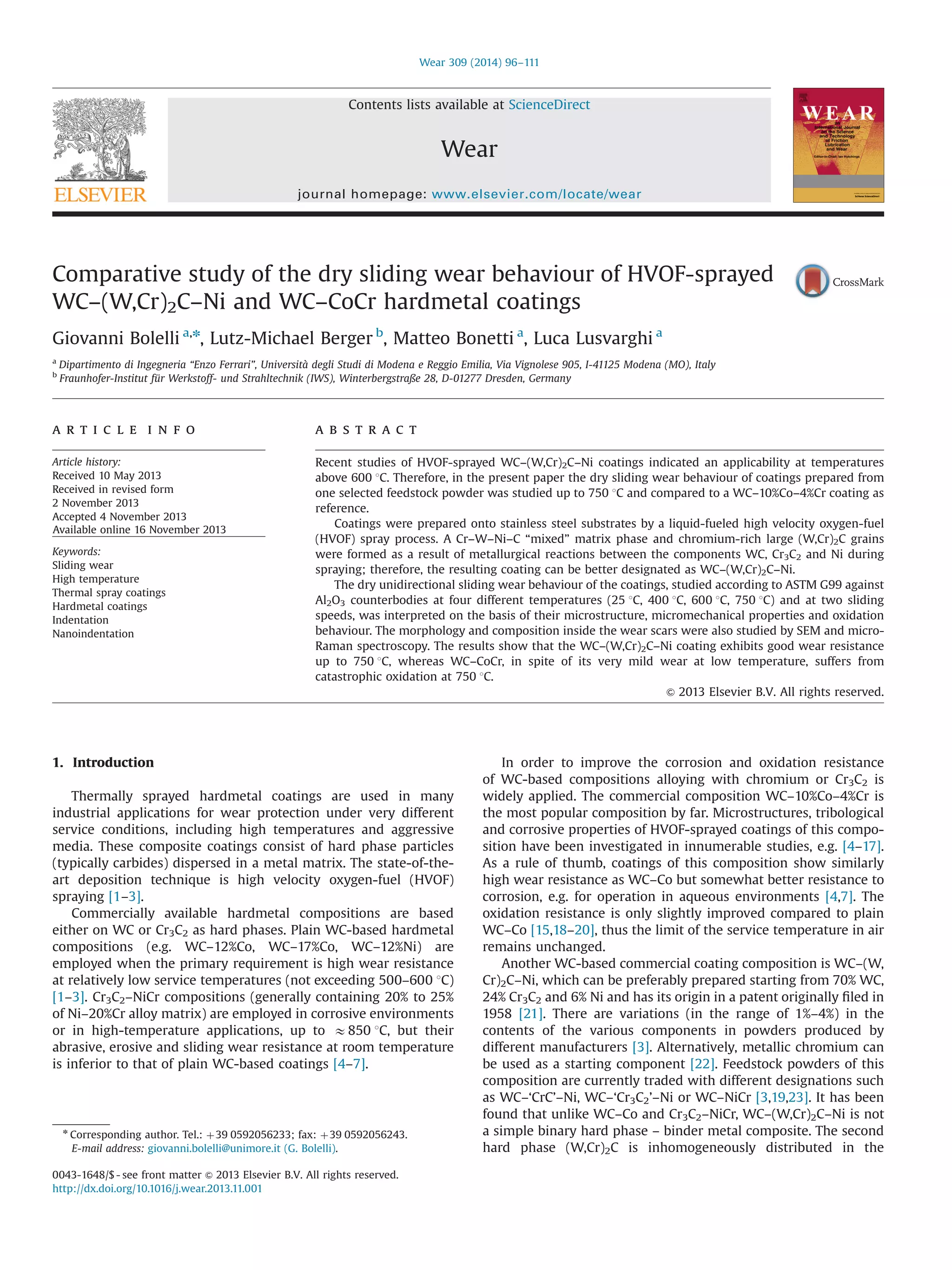 This document summarizes a study that compares the dry sliding wear behavior of two types of HVOF-sprayed hardmetal coatings: WC–(W,Cr)2C–Ni and WC–10%Co–4%Cr (WC–CoCr). The coatings were tested at different temperatures up to 750°C against alumina counterbodies. The WC–(W,Cr)2C–Ni coating exhibited good wear resistance up to 750°C, while the WC–CoCr coating suffered from catastrophic oxidation at 750°C. Analysis of the microstructures, properties, and wear mechanisms provided insight into why the WC–(W,Cr)2C–Ni coating performed