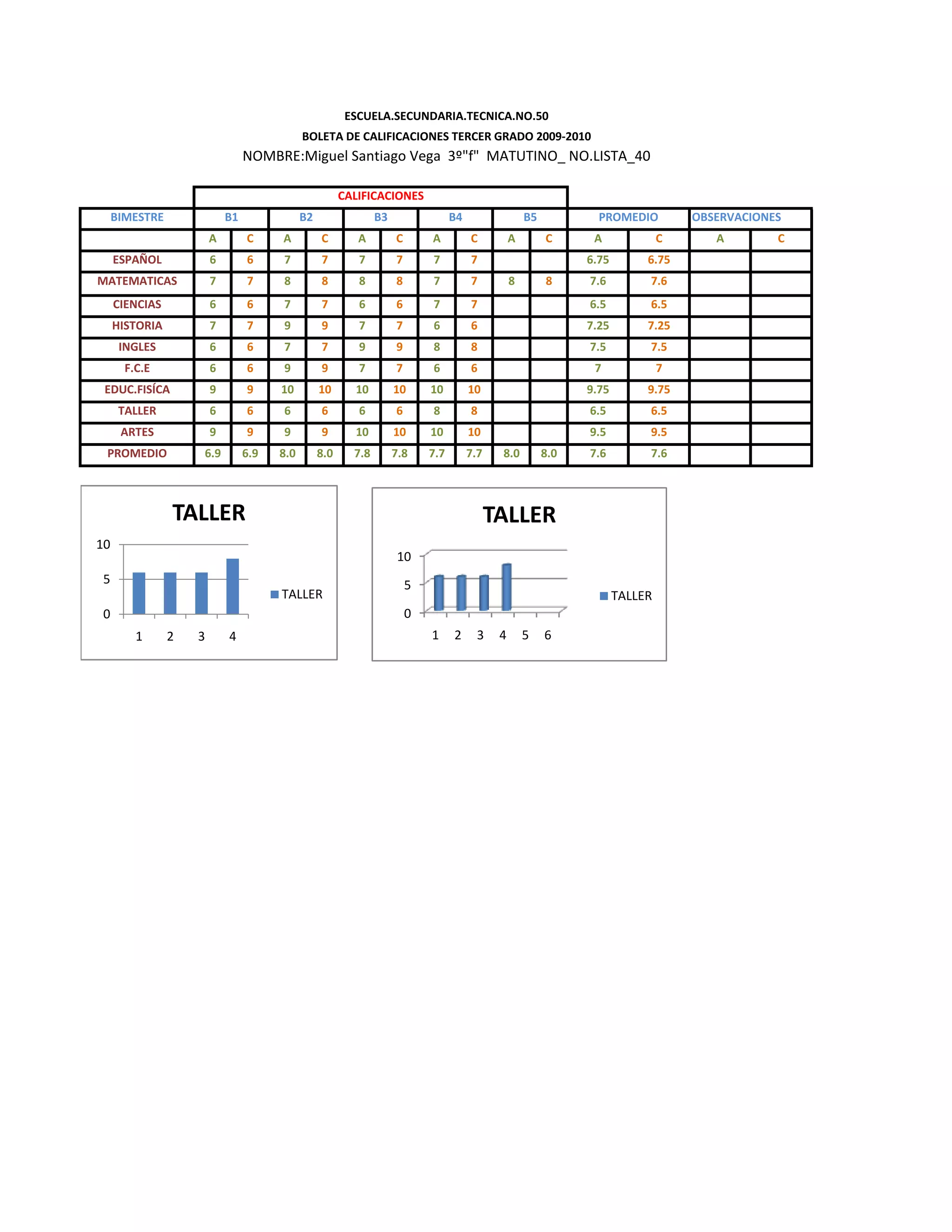 BOLETA DE CALIFICACIONES TERCER GRADO 2009-2010 NOMBRE:Miguel Santiago Vega 3º"f" MATUTINO_ NO.LISTA_40 CALIFICACIONES BIMESTRE B1 B2 B3 B4 B5 PROMEDIO OBSERVACIONES A C A C A C A C A C A C A C ESPAÑOL 6 6 7 7 7 7 7 7 6.75 6.75 MATEMATICAS 7 7 8 8 8 8 7 7 8 8 7.6 7.6 CIENCIAS 6 6 7 7 6 6 7 7 6.5 6.5 HISTORIA 7 7 9 9 7 7 6 6 7.25 7.25 INGLES 6 6 7 7 9 9 8 8 7.5 7.5 F.C.E 6 6 9 9 7 7 6 6 7 7 EDUC.FISÍCA 9 9 10 10 10 10 10 10 9.75 9.75 TALLER 6 6 6 6 6 6 8 8 6.5 6.5 ARTES 9 9 9 9 10 10 10 10 9.5 9.5 PROMEDIO 6.9 6.9 8.0 8.0 7.8 7.8 7.7 7.7 8.0 8.0 7.6 7.6 TALLER TALLER 10 10 5 5 TALLER TALLER 0 0 1 2 3 4 1 2 3 4 5 6