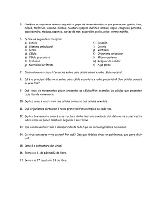 5. Clasifica osseguintes animais segundo o grupo de invertebrados ao que pertenzan: gamba, lura,