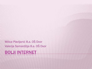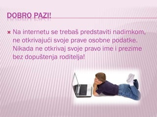 Dokument savjetuje korisnicima interneta, posebno mladima, kako ostati sigurni online, uključujući korištenje nadimaka umjesto pravih imena i brisanje sumnjivih e-mailova. Također naglašava važnost ne slanja zlonamjernih poruka, redovnog čišćenja računala i korištenja antivirusnih programa. Preporučeni su resursi za dodatne informacije o sigurnosti na internetu.